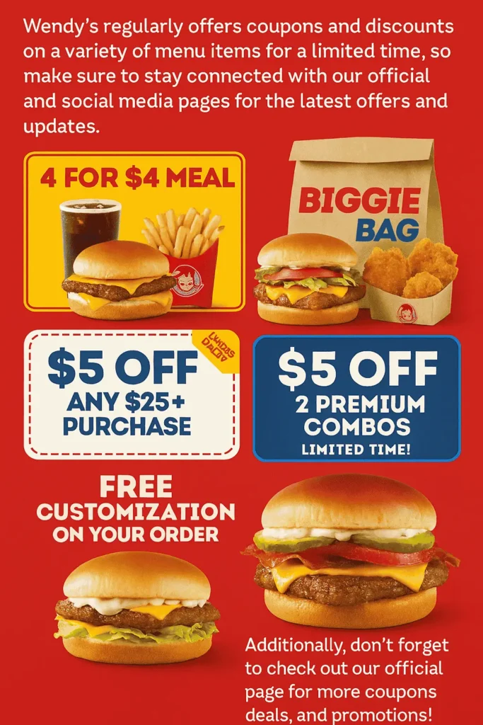 Wendys regularly offers coupons and discounts on a variety of menu items for a limited time, so make sure to stay connected with our official and social media pages for the latest offers and updates. Here are some current deals: